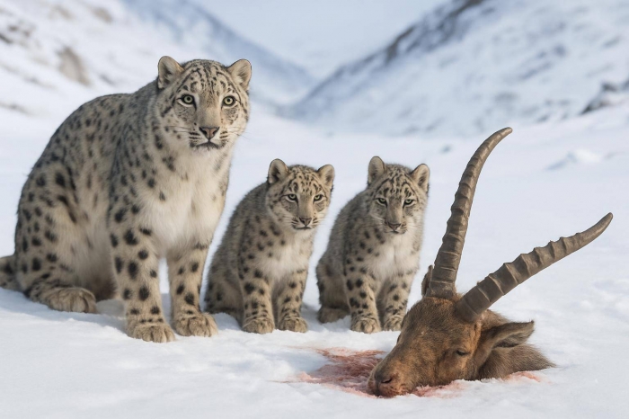 В редакцию Zakon.kz поступило видео, на котором снежный барс с двумя котятами удаляется от убитого марала в районе Алма-Арасана. Кадры были сняты 28 января 2026 года.