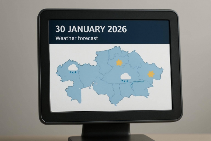 РГП "Казгидромет" сообщило прогноз погоды на 30 января 2026 года, указав на преимущественно безосадочную погоду в большинстве регионов страны и возможные осадки на западе, севере и юге.